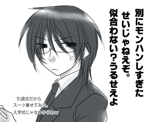 引退式にはなんかスーツ着てったんじゃないかなあと。サイズ普通のだとでかいから特注で。 手に持ってるのはPSP。(モンハンしてると思われる)あと眼鏡なのはちょっとネタで似合うかどうかの 確認してみたら想像した通りの似合わなさで・・・ねえ・・。